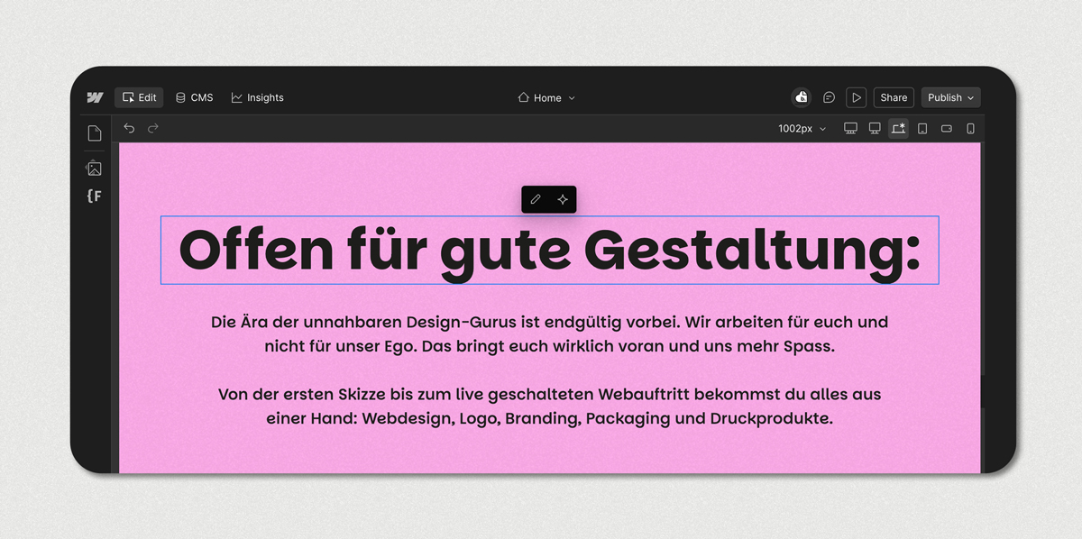 Wie bereits im alten Legacy Editor hast du auch im neuen Content Editor die Möglichkeit, kleinere Textanpassungen direkt auf den Seiten vorzunehmen. Bitte nimm weiterhin nur kleine Korrekturen vor und lösche keine Felder oder Bereiche, da dies das Design beeinträchtigen kann.